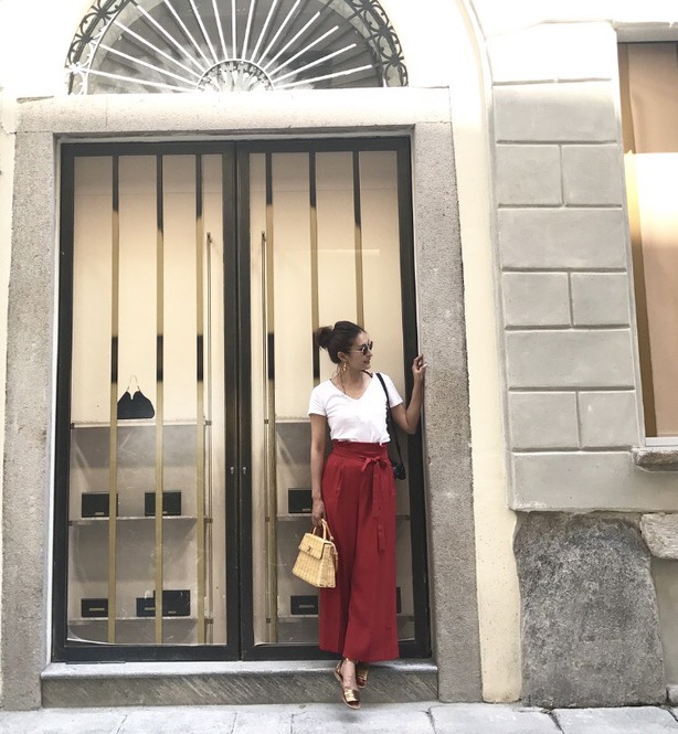 さらにGAPのTシャツは、Vネックもお気に入り。ちょうど良い空き具合でデコルテを美しく見せてくれます。赤のワイドパンツに合わせてフェミニンな雰囲気に。