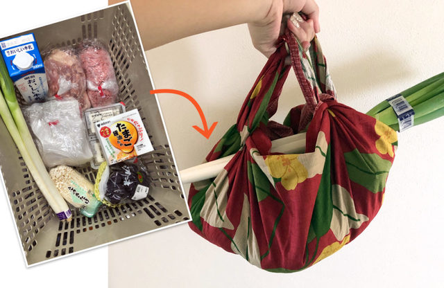 最初はフィットする形を作るのに3分ほどかかっていましたが、慣れてしまえば、スーパーで会計後1分あれば完成します。今では物によって口を広めにしたり小さくしたり工夫することもできるように。以前は、エコバッグが邪魔で持って出掛けなかった日に限って、買い足しが必要なことを思い出して結局レジ袋も購入するなんていうこともありました。風呂敷ならバッグのすき間に入れておけるので、そんな無駄もかなり減らせますよ。