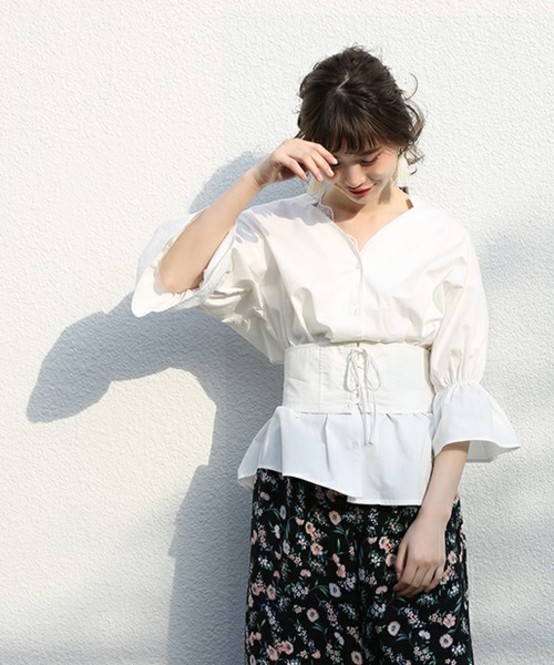 ウエスト部分に大きなリボンをプラスすることで、ぽっこりお腹も目立ちませんね。小花柄でアンティークなブラウスは、大人女子でも着こなしやすいです。