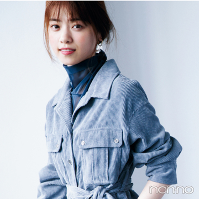 コーデュロイのカジュアル感に、ベルトで女らしさをプラス。メリハリがつくから、ボタンを留めたコーデもおしゃれに決まる。