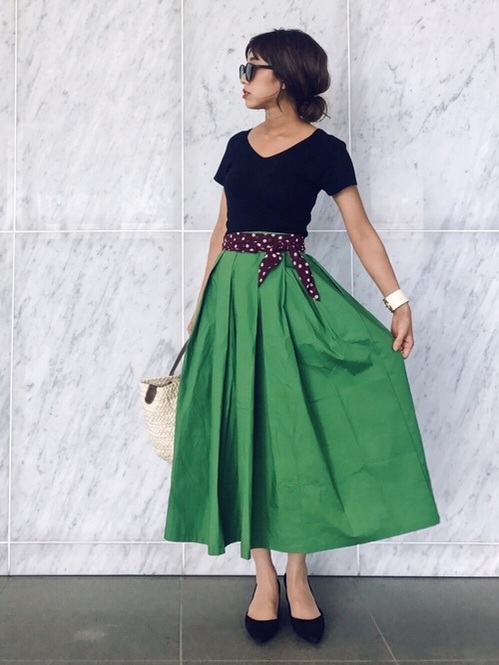 コーディネートに取り入れるだけでおしゃれに見える、グリーンのスカートは1枚は持っておきたいアイテム。スカーフを腰に巻いてベルト代わりにすれば個性も出て、おしゃれです♡