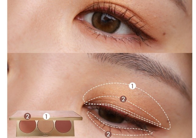 中央のハイライトカラーをアイホール全体に、左側の「ジンジャー」を二重幅に塗ります。指を使ってポンポンとラフに塗るのがポイントです。