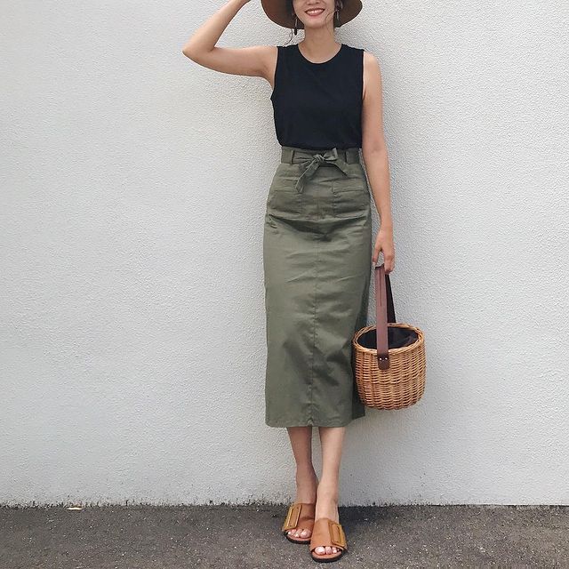 メンズライクなカーゴ風のタイトスカートは、女性らしいカジュアルコーデにピッタリ。コンパクトな黒のノースリーブを合わせた、Iラインの美シルエットが大人らしい着こなしです。