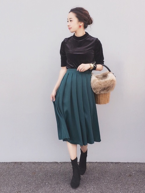 ベロアカットソーを着まわして追加したのはMODE ROBEで購入したフォレストグリーンのプリーツスカート。ベロア×秋色でシーズンライクなスタイリングに。ファー小物やショートブーツで秋感がさらに盛り上がっていますね。