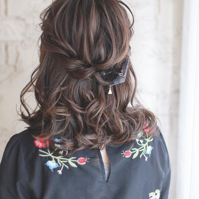 あえてのアシンメトリーが、とってもおしゃれなハーフアップは、くるりんぱを2回しただけで、簡単に作る事ができます。華やかさも可愛らしさも、両方兼ね備えたヘアアレンジです。