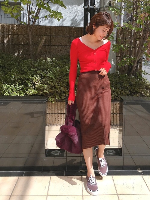 ブラウンでも赤みがかったレッドブラウンが秋にはおすすめ。白スニーカーを秋色にチェンジすればコーデにも統一感が出ます。赤〜レッドブラウン〜エンジのグラデーションコーデで印象的に仕上げてみて。