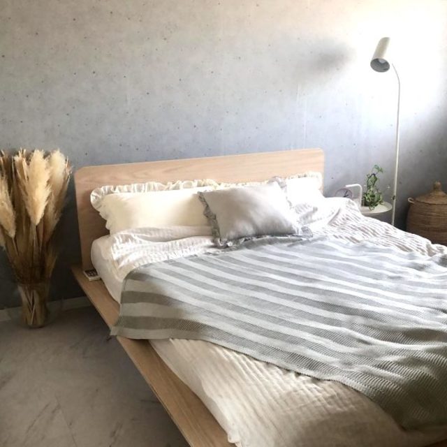 特にこれからの季節はパンパスグラスがぴったり合います。ベッドリネンはシンプルにまとめ、植物で華やかさを出すのも素敵ですね。