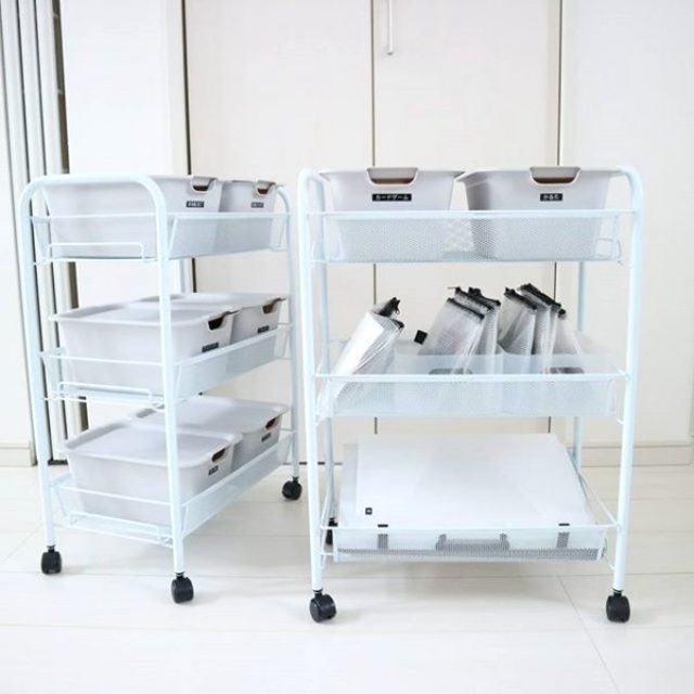 セリアの収納アイテムを使って、お片づけワゴンを作ってみませんか?こちらの実例で使われているアイテムは、蓋つきボックスとジップケースの2種類です。
