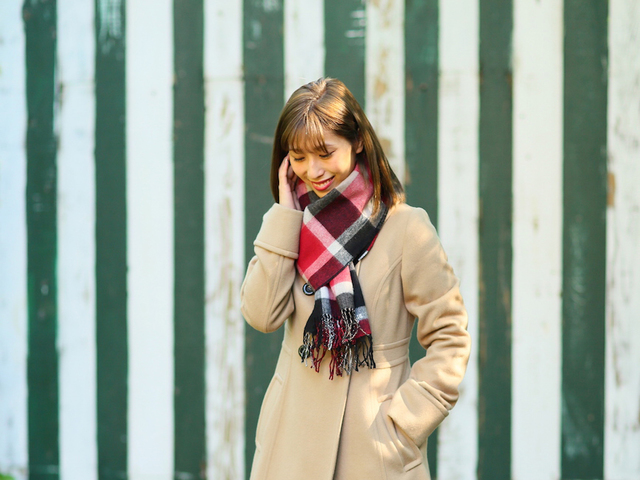 女性らしい品格のあるコートには、チェックのマフラーを合わせて華やかな印象に。裏面が無地のリバーシブルなので、その日のスタイリングに合わせて、違う巻き方をすると一気に印象を変えることができる優秀アイテムです♡