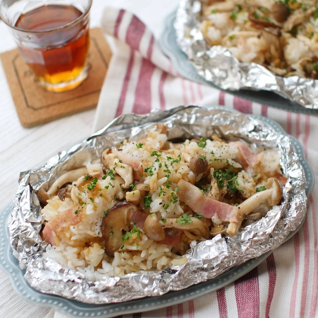 アルミホイルを利用して調理することで、食材にじっくり火が入ってベーコンやきのこのうまみが引き出されます。フライパンや皿を洗う手間がないのでとっても楽チン!冷凍ごはんを使う場合は、解凍してから調理してくださいね。