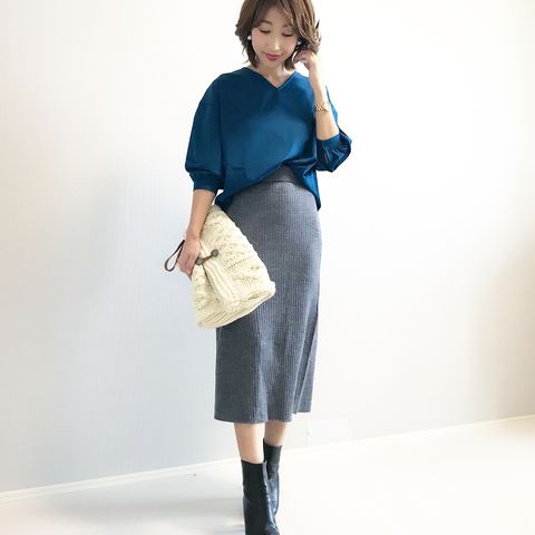 きれいめなスカートにドルマンスリーブのニットを合わせることで、程よい抜け感を演出することができます。ショート丈のニットなのでウエストインしなくても野暮ったく見えないところがポイント。