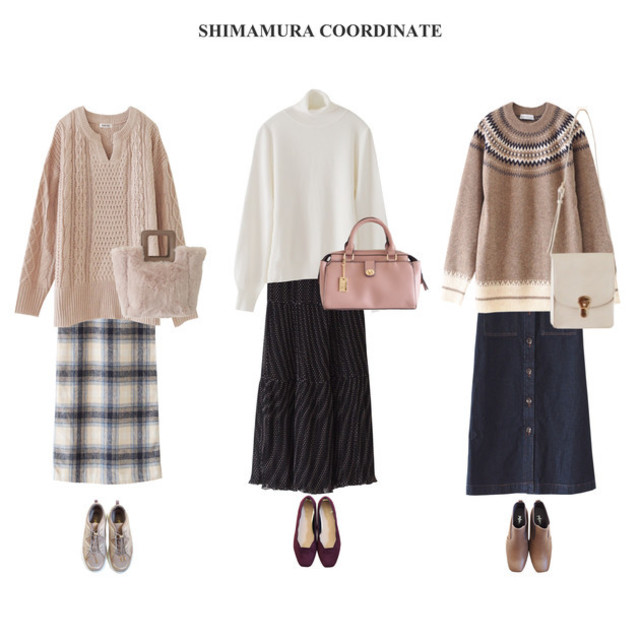 ケーブル編みニットとチェック柄スカートで作る休日スタイル。