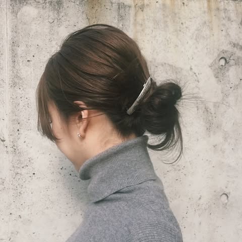 時計回りにねじってお団子を作ったら、ピンを垂直に差し込んでから横に倒すとしっかりと固定できます。おくれ毛のバランスがいいのもボブの魅力。オイルなど質感を遊んだりコテで動きをつけたりとアレンジ自在です。