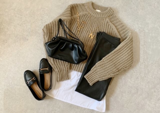 短め丈のニットにシャツをレイヤードしたら体型カバーも◎