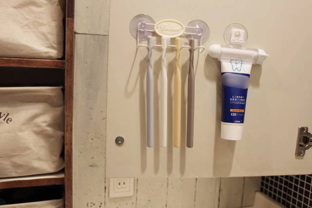 凹凸のない滑らかな面(タイル・ガラス・金属塗装面など)に吸盤を取りつけて使用します。歯ブラシはU字になった箇所に、最大4本収納が可能ですよ♪