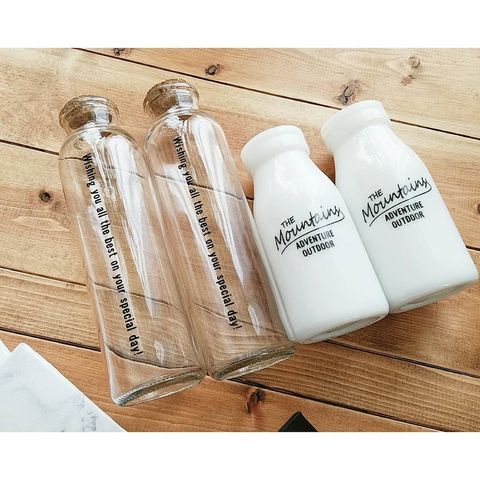 キャンドゥ発売の英字ロゴ入り瓶はお花を飾ったり、箸入れにする方が多いようです。スリムタイプと牛乳瓶タイプがあり、ロゴもいろいろ種類があるんだとか。シンプルなインテリアのアクセントにおすすめです♡