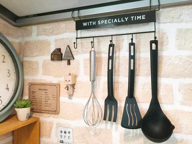 さっそくひと通りキッチンツールを引っ掛けてみました♪壁にかけられるのでスペースも取らず、サッと取りやすくてとっても便利!