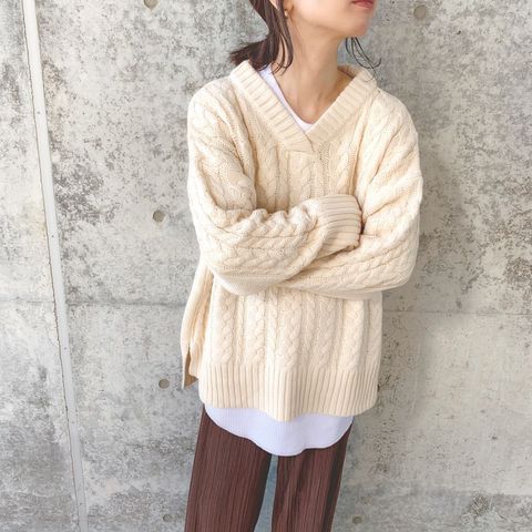 抜け感たっぷりなザックリとしたVネックと、丸みのあるシルエットで女性らしい印象を与えてくれるニットは、腰回りが隠れる長めの丈感で体型カバーも叶います。春先にはTシャツとのレイヤードを楽しめそう。