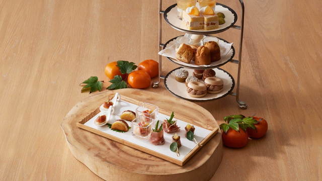 「柿アフタヌーンティー」は、甘く熟した“柿”をふんだんに使ったアフタヌーンティーです。スイーツには、ほろ苦いアーモンドクリームとキャラメルチップが柿の風味を引き立てるタルトや、柿にチョコレートやシャンティクリームを組み合わせたショートケーキなどがラインナップします。