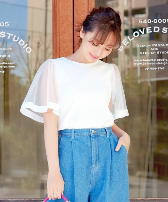 揺れるチュール袖が華やかなカットソートップス。シンプルなデザインで、どんなボトムにも合うアイテムです。