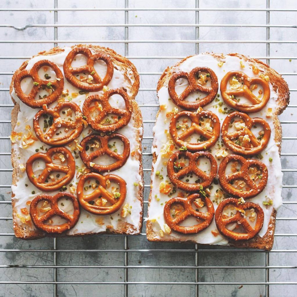 「プレッツェルオープンサンド」のレシピと作り方を動画でご紹介。トーストにクリームチーズフロスティングを塗り、プレッツェルを並べてピスタチオとオレンジピールをトッピングしました!見た目もかわいく、プレッツェルの塩気が抜群のひと品です♪