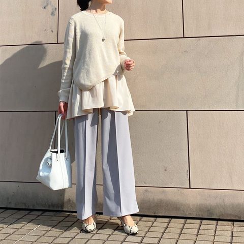 バレエジュースは、大人の女性が持つ上品さを残しながらコーデをカジュアルダウン。イレヘムドッキングニットプルオーバーとトーンを合わせたベージュ系で、こなれた仕上がりに。