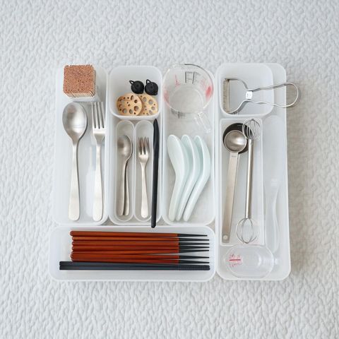 ごちゃごちゃしやすいカトラリー収納には、ポリプロピレン収納が最適。おもしろいことに、ティースプーンなどの小さいカトラリーにはペンボックスがピッタリなんです。大きさや用途別に使い分けることで、引き出し内も散らからずに収納ができます。