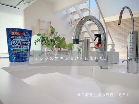 オキシウォッシュで、シンクの掃除とお鍋のお手入れが一緒にできます。泡立ちもよく油汚れに強いオキシウォッシュは、無香料なので香りに敏感な人にもオススメです。