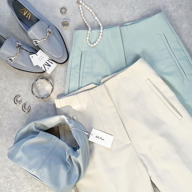ブルーで揃えたコーデのほか、ホワイトやベージュコーデのポイント的に使うのもあり。履くだけで春トレンドたっぷりな上品コーデになります。