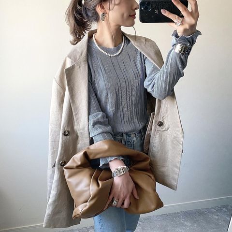 ダンボール素材はボリュームがあるため、春らしさを望む中でアウターを羽織ると重たくなってしまいます。防寒性を高めるなら、インナーのレイヤードが◎。ボリュームがある分、中に着込みやすいですよ。