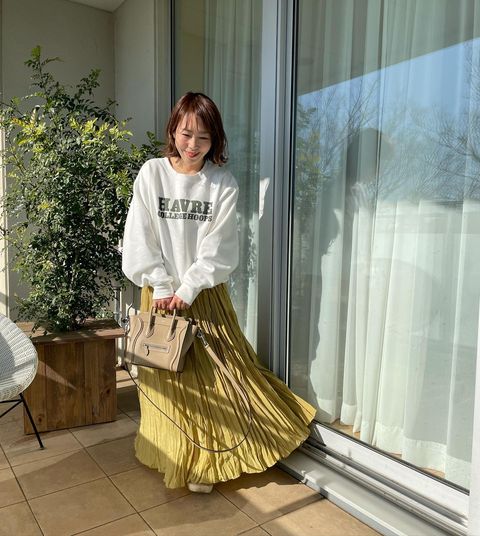 ベーシックカラーがベースのロゴスウェットは、色物と相性抜群。中でもロゴスウェットが持つカジュアルエッセンスと馴染みの良いイエローがオススメです。女性らしくもヘルシーな印象に仕上がります。