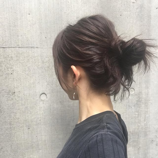 少し高めの位置でラフにまとめたお団子は、カジュアルでオシャレ感も抜群。余った毛先をルーズに散らすのが、こなれて見せるポイントです。