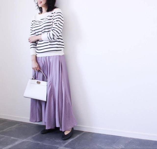 ボーダーアイテムは単品だとトラッド感が満載ですが、ボトムはトラッドと離れたふわっとしたスカートを合わせてみると、雰囲気を一新できます。