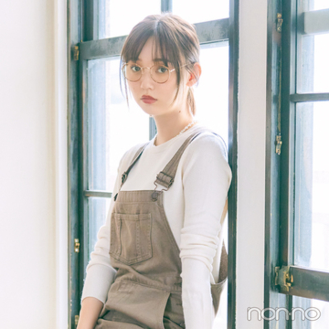 オーバーオール¥2990・ニット¥1690(9月下旬発売)・サングラス¥990/GU ネックレス¥330・バッグ¥2200/ラティス 靴¥2690/AmiAmi