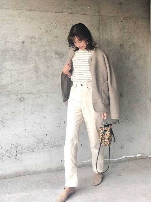 この冬のトレンド、ボアアウターはベージュをチョイスすることで上品見えが狙えます。優し気なベージュボーダーをチョイスすることで、カジュアル過ぎない大人のボーダーコーデに。