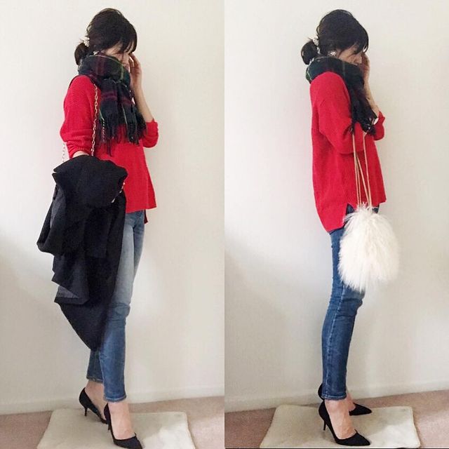 こちらは赤ニットに、緑のチェック柄マフラー、白のファーバッグでまさにクリスマスカラーの着こなしです。デニムを合わせたカジュアルコーデも、クリスマスカラーならいつもより華やかになれます。