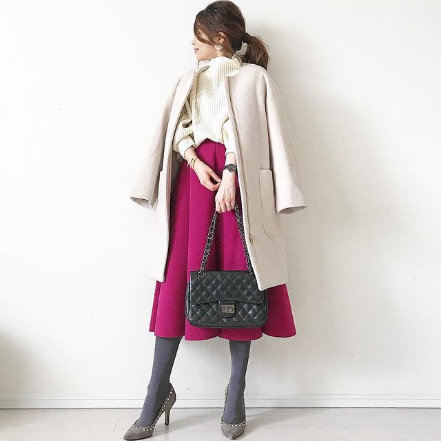 ホワイトカラーのコーディネートにはビビッドなピンクスカートを合わせて、冬のデートシーンにピッタリな華やかスタイルに。グレーのタイツを合わせることで、大人シックな印象にまとめることができます。