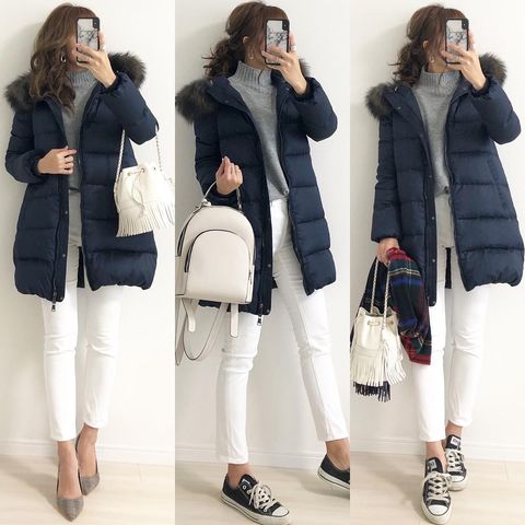 こちらは、グレーのタートルネックニットとネイビーのダウンコートに、細身シルエットな「白ハイライズシガレットジーンズ」を合わせたコーデ。ボリュームのあるトップスとアウターに、細身パンツでスタイリッシュなコーデに仕上がっています。