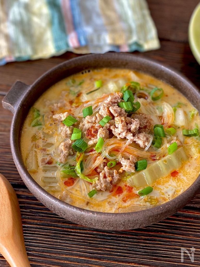 濃厚な旨みがたまらない、坦々風の春雨スープ。練りごまを使わず、身近な調味料と豆乳でおいしく作れます。香ばしく炒めた豚ひき肉と白菜が絡んだ春雨まで超絶品。お好みで、ラー油や小ねぎを振ってどうぞ。