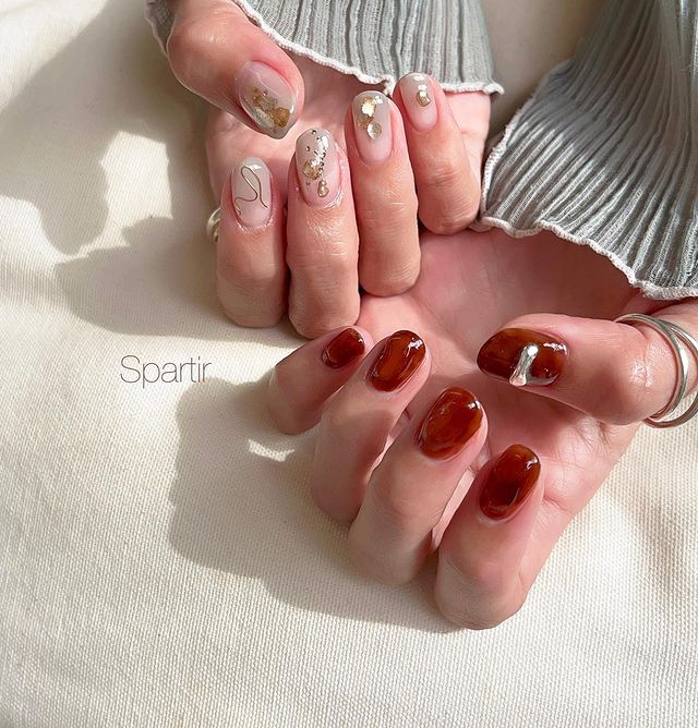 オレンジブラウンの中でもオレンジが強めだったり、ブラウンが強めの色味があるので、好みや肌に合うカラーをチョイスしてみて。こっくりとした色味はショートネイルとの相性抜群ですよ♡