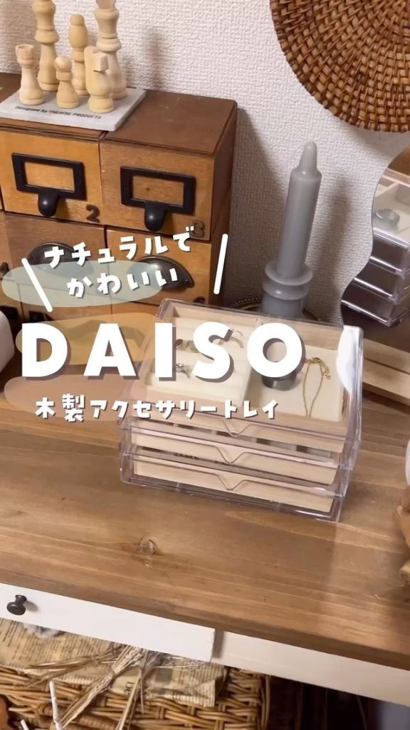 ダイソー新商品の木製アクセサリートレイは、そのナチュラルさでさっそく人気商品に♡別売りの200円の3段引出しケースにもきちんとはまり、セットにしても500円なんてうれしすぎますよね。