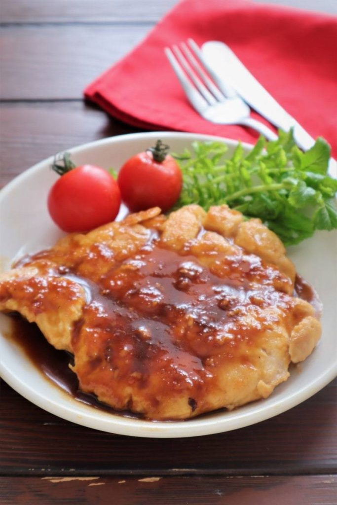 お肉が好きな人にとってテンションが上がりそうな、鶏むね肉を丸ごと1枚使ったステーキはいかが?厚みのある部分は切り込みを入れて平らにすると、均一に火が通ります。生姜やにんにくをたっぷりと加えたソースで食べればもう絶品!(調理時間:10分)