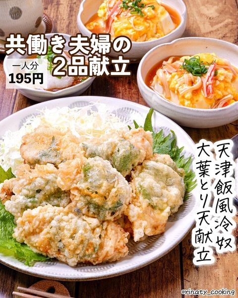 コスパの良いむね肉を使ったとり天です。衣はサクッとお肉はふっくら柔らか、一口食べたらやみつきになるおいしさです。大葉の香りのアクセントも◎。