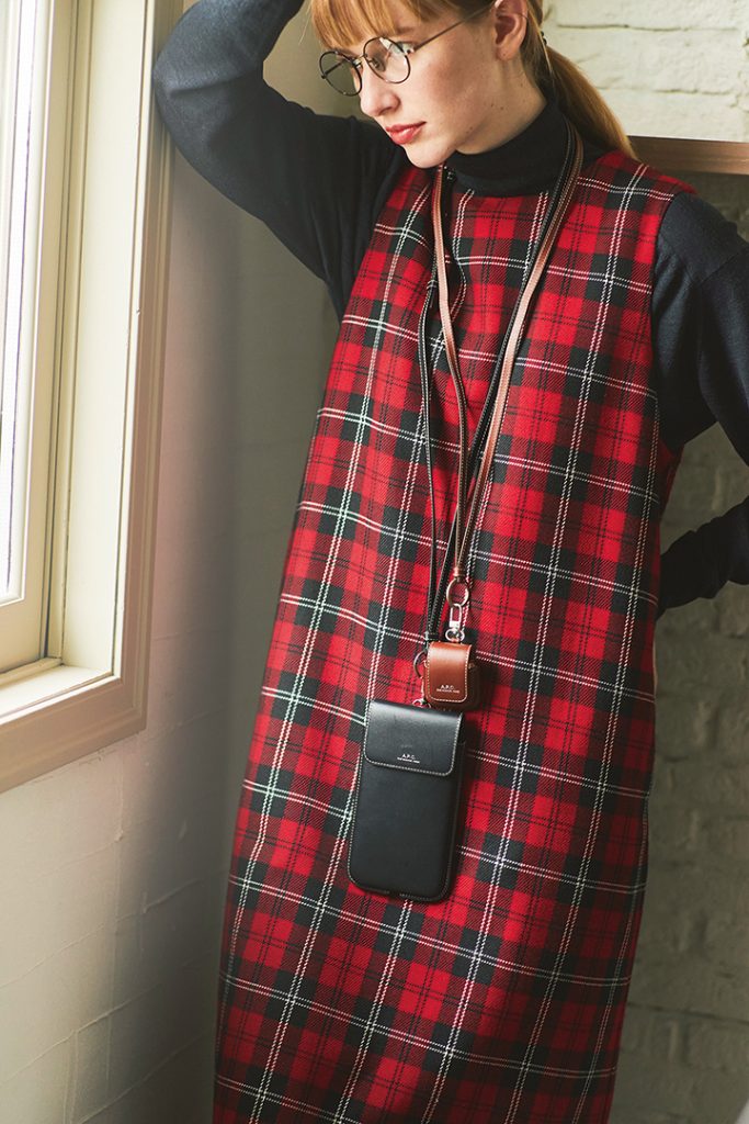 コーディネートを選ばないシンプルなスムースレザーのケースたち。 スマートフォンケースはメンズでも斜めがけできる長めストラップなので、コートの上からでも。