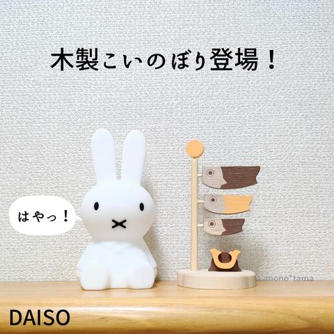 ダイソーからは木製置物こいのぼりも発売。自然の温かみが感じられる北欧風のデザインで、優しい色合いのこいのぼりと兜が可愛いです。