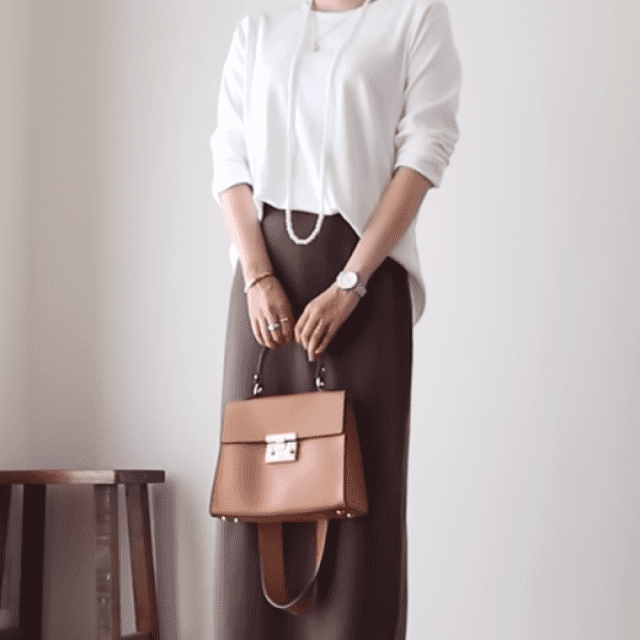 今回スカートは昨年の秋に購入したブラウンのものを着用していますが、これからの春の季節であれば、もっと明るい色合いのスカートでも白Tやデニムとの相性はいいと思います。