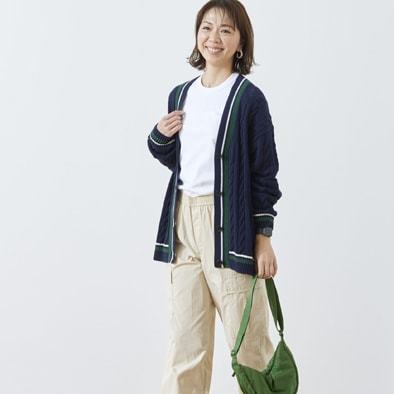 クリケットカーディガン¥4,990(ユニクロ アンド ジェイ ダブリュー アンダーソン/ユニクロ)イージーカーゴパンツ¥3,990 エアリズムメッシュクルーネックTシャツ<半袖>¥1,500 ラウンドミニショルダーバッグ¥1,500 コンフィールタッチフラットシューズ¥3,990(すべてユニクロ)アクセサリー(私物)※すべてMサイズを着用