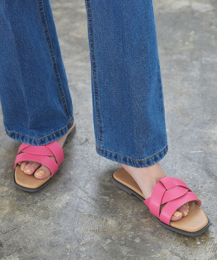 大人カジュアルを演出するフェイクレザーフラットサンダルです。印象的なクロスデザインが、抜け感のある足元作りに重宝する一足です。豊富なカラーバリエーションも魅力的。