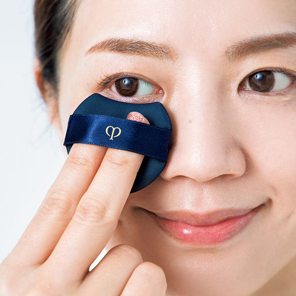 ③目頭〜目尻の目の下は、付属のパフのカーブを上手に使いましょう。目の下がきれいだと全顔まで美しく見えるので、丁寧に塗ります。