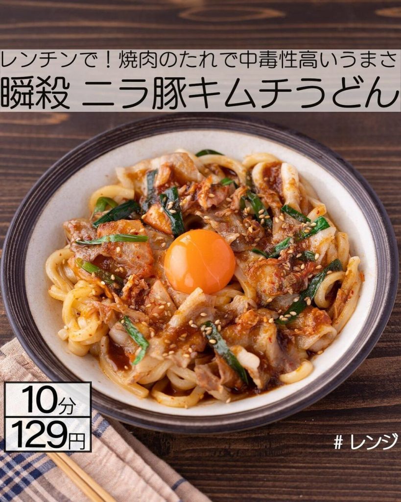 豚バラ肉とキムチという最高の組み合わせは、うどんに混ぜればボリュームアップ。ニラも加えて、風味豊かに仕上げています。味つけは焼肉のたれとめんつゆで簡単。トッピングの卵黄をつぶして食べると、より濃厚でおいしいです。